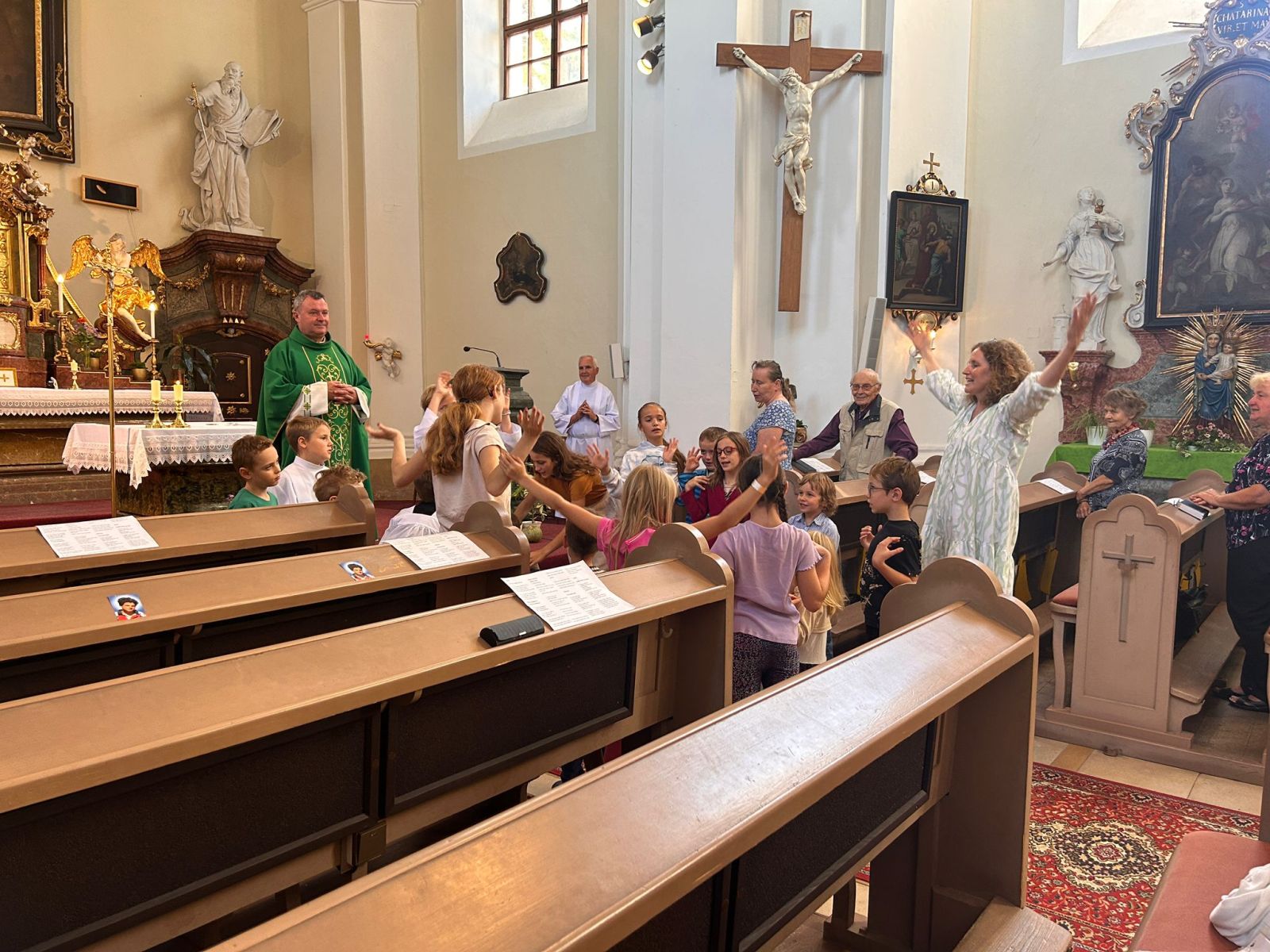 2025 V neděli 21. září jsme slavili mši svatou zaměřenou na děti. Děti se hezky zapojili do mešních služeb a v závěru spolu zpívali ukazovací písničku. Po mši svaté byla farní kavárna na faře. Máme radost ze všech zúčastněných! Farní fotogalerie 2025 » Zářijová dětská mše 2025
